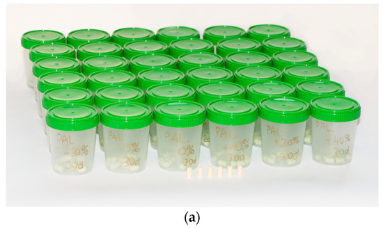 Figure 2a shows a group of samples prepared for seasoning. The samples were placed in separate containers in groups according to seasoning time: unseasoned, seasoned for 1 day, 10 days, 20 days and 30 days.