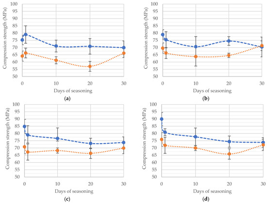 Compressive strength tests were conducted immediately after weighing the seasoned specimens. According to the test plan and the previously mentioned ISO standard, the results obtained were averaged and, taking into account the standard deviation, are presented in the following diagrams. Figure 4 shows the compression strength results grouped according to the inaccuracy of the liquid component dosage measured with increasing seasoning time. The data clearly show that the average compressive strength decreases with seasoning time. This is particularly evident for cements made with an excess of the liquid component.