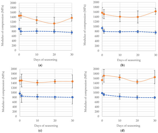 A summary of all the results obtained from the tests is shown in the comparison of manufacturing inaccuracy from seasoning time in Figure 5a,b.
