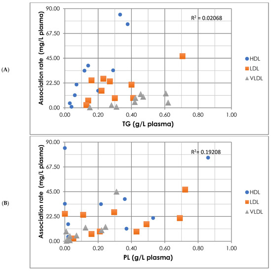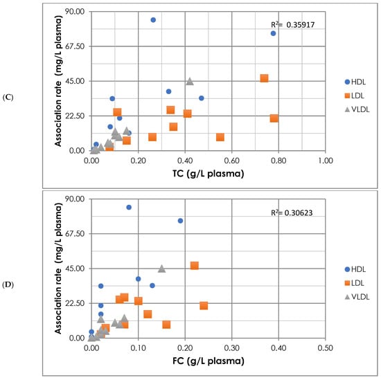 CycloA is a hydrophobic drug that can interact with the lipid components of lipoproteins as well as the proteins on their surface. The biochemical composition of all the types of lipoproteins was studied in order to find a correlation with the association rate of CycloA. This biochemical analysis included studying the concentrations of triglycerides (TG), total cholesterol (TC), free cholesterol (FC), esterified cholesterol (EC = TC − FC), phospholipids (PL) and proteins and was carried out before incubation of each type of the lipoproteins with CycloA. The obtained data were normalized to 1 L of plasma to facilitate comparison. The rates of CycloA association were then compared and related to the composition of the lipoproteins. A correlation between the association rate of cyclosporine A with the different lipoproteins and the concentration of the individual components of the lipoproteins is expressed in Figure 1 and Supplementary Table S1. The highest correlation was found to be associated with the protein concentration in the lipoproteins (0.83). The triglycerides and cholesterol levels, either free or esterified, follow; then, the effect of phospholipids was found to be very limited. In addition, a specific correlation was performed for each type of lipoproteins independently, and the results are stated in Table 2.