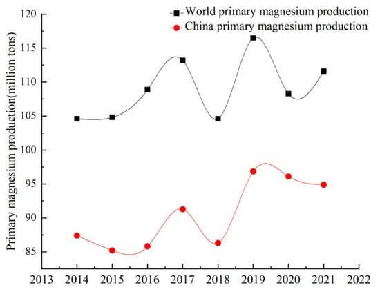 Magnesium is widely used in the aerospace, aviation, automobile, metallurgy and chemical industries due to its low density, high strength, specific rigidity and good die-casting performance [,,]. It has good electromagnetic shielding and shock absorption, making it useful in the field of electronic technology where precision equipment also plays an extremely important role, known as the ‘21st century the most development and application potential of green engineering materials’. Magnesium resources are abundant, mainly in the form of solid magnesium-containing minerals and magnesium-containing evaporative minerals (seawater, brine, salt lake) [,,,,]. At present, the reserves of magnesium-containing resources meet human needs. Natural brine can be regarded as a recyclable resource, and mined magnesium will be regenerated in a short time. China has rich resource reserves, energy advantages and smelting policies. Since 1998, China’s magnesium production has ranked first in the world, and magnesium ingots, magnesium alloys and other magnesium products have been exported worldwide. The output of magnesium metal in China and the world from 2014 to 2021 is shown in Figure 1 []. China’s production of primary magnesium ingots fell sharply in 2018 due to the novel coronavirus pandemic, but it remains the world’s largest supplier of magnesium ingots, accounting for more than 80% of global production. The Pidgeon process has become the main magnesium smelting process in the world because of its fast construction, small investment and diversified heat sources [], but it has the disadvantages of a long production cycle, high energy consumption and large emissions. With the continuous research and improvement in magnesium smelting technology at home and abroad, the mechanization and automation level of smelting technology and working conditions have been improved, the production energy consumption has been reduced and some waste slag has been recycled. However, its intermittent production characteristics seriously restrict the production of magnesium, and there is a cooling process between the pellet calcination and reduction process, resulting in a large amount of energy loss. Many researchers have studied the influence on the dynamic performance, heat transfer performance and processing parameters of the magnesium smelting process. However, for the smelting process, energy consumption and carbon emissions are equally important. With the increase in climate temperature year by year, low-carbon emission reduction has become a hot topic in current society. In order to ensure a healthy and comfortable living environment and improve people’s quality of life, the smelting method for metal magnesium must have a good economy, low-carbon emission, production continuity, excellent product quality, reliable production stability and production safety. Based on the study of energy consumption and carbon emission of different magnesium smelting methods, this paper compares and analyzes the electrolysis method, silico-thermal reduction method, carbon thermal reduction method and aluminum thermal reduction method. The energy consumption and environmental impact are further reviewed to provide a reference for scientific research in the field of magnesium smelting.