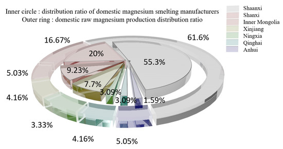 According to statistics from the Magnesium Industry Branch of the Non-ferrous Metals Association [], the demand for raw magnesium is concentrated in the metallurgical field (aluminum alloy addition, steelmaking desulfurization, ball milling cast iron and metal reduction) and processing field (rare earth magnesium alloy, castings, die castings and profiles). The domestic original magnesium capacity concentration is low, with more than 30,000 t of production capacity from only 13 companies for a total market share of 35.9%. The distribution of domestic magnesium smelters and raw magnesium production in 2020 is shown in Figure 2 [,,,,,,,].