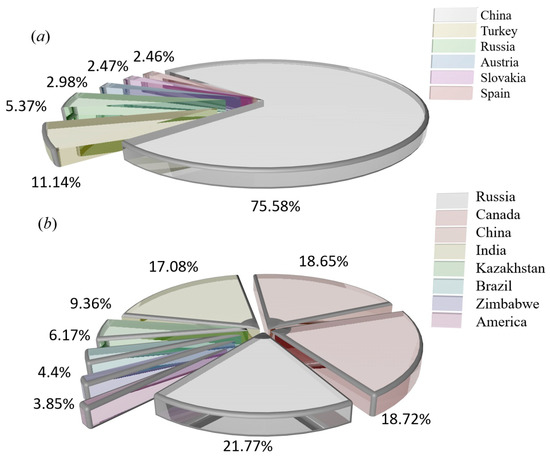 (a) Production histogram showing the world’s major magnesite producing countries. (b) Production percentage pie chart showing the world’s serpentine producing countries.