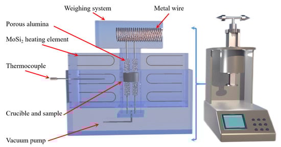 Jibiao Han et al. [,] studied the nucleation and condensation mechanism of Mg vapor carried by argon and concluded that the condensation temperature of Mg vapor is influenced by the heat source temperature, the partial pressure of Mg vapor and the flow rate of argon. When the heat source temperature was 1473 K and the argon flow rate was 0.2 m3/h, the condensation temperature of magnesium vapor was 1013.3 K. The increase in Mg vapor supersaturation and the decrease in condensation temperature were favorable to the growth of liquid nucleation. The higher the purity of the condensation product, the less likely it was to be oxidized in the argon gas stream. Using a further experiment, it was concluded that when the partial pressure of magnesium vapor is lower than 371.2 Pa, the condensation phenomenon is produced; however, when higher than 371.2 Pa, the liquefaction process of magnesium vapor exists. Yusi Che et al. [] optimized the design of a thermogravimetric analyzer, the schematic diagram of which is shown in Figure 4. The silico-thermal reduction CaO·MgO reaction under vacuum and high-temperature conditions was investigated. The thermogravimetric losses in the pellets were determined by varying the heating rate (1.5, 2.0, 2.5, 3.0 °C/min) at 5 Pa vacuum and 300 to 1400 °C. The thermogravimetric curves for the starting and ending sections of the reaction were analyzed in terms of shape characteristics, the half-width ratio of differential thermogravimetry and kinetic parameters, yielding an activation energy of 233.42 KJ/mol and a finger-front factor of 5.14 × 1010 s−1.
