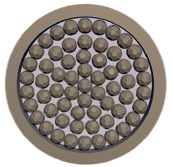 Zhang et al. [] studied the reaction and heat transfer mechanism of magnesium smelting using the silico-thermal method by establishing an unsteady model for radiation and heat conduction coupling. It was concluded that the minimum temperature of the pellets is 1203 K after 2 h of production, and the average reduction rate of the materials is 66% after 4 h. With the extension of calcination time, the reaction area was close to the center of the reduction tank. Due to the decrease in pellet quantity and heat transfer efficiency in the central area, the magnesium yield in the first half cycle was much higher than that in the second half cycle. The pellets are arranged in the reduction tank as shown in Figure 6.