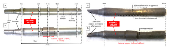 (a)—Unsupported and (b)—supported vulnerable tubes, creeping miniature distillers, exposed to 1200 °C and 10 Pa internal temperatures for 60 Days. The distance from B to A is 12 cm, from C to A is 15 cm, from D to A is 18 cm, from E to A is 27 cm.