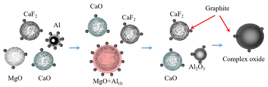 Teng Zhang et al. [] subjected a mixture of MgO:Al:Ca(OH)2 with a molar ratio of 3:2:1 to aluminothermic reduction at atmospheric pressure and temperature of 1223 K. It was concluded that high-energy ball milling can strengthen the aluminothermic reduction mixture of magnesium oxide and calcium hydroxide and successfully prepare high purity magnesium crystals. The particle size of magnesium powder increased with the increase in ball milling time and decreased with the increase in sodium stearate content. It was also concluded that high-energy ball milling led to a decrease in the apparent activation energy of the reaction. The solid phase reduction deposit phase mainly consisted of 12CaO·7Al2O3 and Al2O3. The MgO-CaO-CaF2 was reacted with Al-C powder to extract magnesium under atmospheric pressure and 1223 K using mechanical activation technology []. It was concluded that the reduction rate of magnesium oxide is improved with the increase in C, CaO and CaF2 content and the prolongation in ball milling time. Adding C powder to the reactants during ball milling can enhance the reactivity of Al. When the CaO content is 20~30 wt%, the reaction process is MgO reduction to form 12CaO·7Al2O3, magnesium aluminate and CaAl1.9O4C0.4, whereas when the CaO content is more than 30 wt%, magnesium aluminate phase disappears. With the addition of CaF2, the reduction reaction is characterized by the reduction of MgO, generating 11CaO·7Al2O3·CaF2 and CaAl1.9O4C0.4. The reaction mechanism is shown in Figure 8.