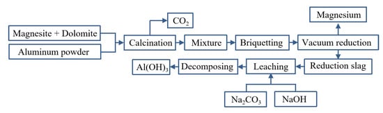 Yaowu Wang et al. [] studied the vacuum aluminothermic reduction of dolomite and magnesite. The slag was mainly A12O3 (more than 67%, in the form of CaO·2A12O3) and CaO. The process flow is shown in Figure 9. When the temperature was 95 °C with the liquid–solid ratio of 5 and the leaching time of 2 h, the mixture of NaOH and Na2CO3 is used to leach aluminum hydroxide from the slag, and the leaching rate of alumina is greater than 86%. The two main reasons for the loss of alumina in the reduction process are the formation of magnesium aluminate spinel and the leaching of 3CaO·Al2O3·6H2O. The chemical composition of aluminum hydroxide obtained after carbonation precipitation can meet the quality standards of an alumina plant.