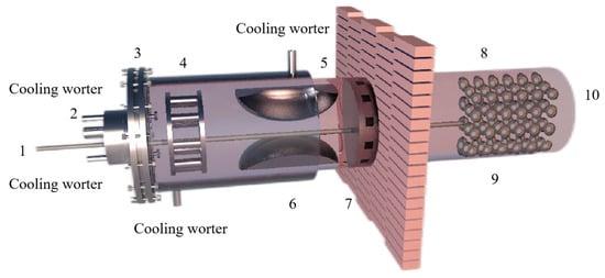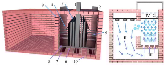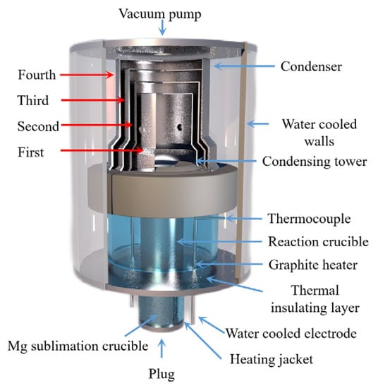 Principle diagram showing the vacuum thermal reduction tank: 1—thermocouple, 2—vacuum tube, 3—water cooling jacket, 4—sodium potassium condenser, 5—magnesium condenser, 6—rough magnesium, 7—heat cut-off, 8—coal hopper, 9—coal hopper and 10—furnace.