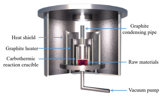 Wenxin Hu et al. [] used Al-Si-Fe alloy as the reducing agent for the Pidgeon method to obtain higher magnesium vapor pressure during the reduction process, and the temperature required for the reaction was reduced. Using a thermodynamic calculation, they concluded that under the condition of a vacuum degree of 4 Pa, Al-Si-Fe alloy has a higher reduction efficiency of 66.8%, shorter reduction time, lower reduction temperature of 1373 K and longer service life. Yaowu Wang et al. [] used the magnesite vacuum aluminothermic reduction method to produce magnesium and obtained a magnesium aluminate spinel by-product. Compared with the Pidgeon process, the ratio of raw materials to crude magnesium in the aluminothermic reduction process was 3.2~3.4:1, the consumption was reduced by 50%, the calcination energy consumption was reduced by more than 70%, the productivity was increased by 100%, the energy saving was more than 50%, the CO2 emission was reduced by up to 60% and zero waste residue emission is achieved. The process flow is as follows: firstly, magnesite is calcined at 850 °C, then the calcined magnesite powder and aluminum powder are mixed and pressed to make balls, and finally, the pellets are placed in a reduction furnace. The bedroom vacuum furnace used in the reduction experiment is shown in Figure 11. It was further concluded that the aluminothermic reduction reaction has the advantages of effectively prolonging the service life of the reduction tank and reducing the maintenance cost due to the low temperature required. Moreover, the aluminothermic reduction process has the characteristics of a high heat transfer coefficient and fast reaction rate, which shortens the reduction time and reduces energy consumption. The reduction slag can be used to produce a high-value-added refractory MA spinel [].