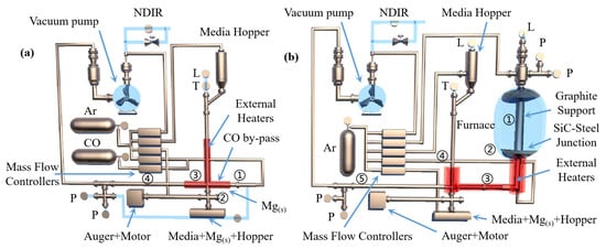 Hamed A N et al. [] used dolomite as the raw material for the carbothermal reduction process. Comparing the solar carbothermal reduction magnesium smelting process with the traditional fire carbothermal reduction magnesium smelting process, they concluded that the most energy-consuming step is the carbothermal reduction of oxides. Thermogravimetric analysis showed that MgO in lime (MgO·CaO) was completely reduced at 1600 °C under normal pressure. This indicated that the carbothermal reduction of MgO·CaO can realize the gradual symbiosis of magnesium and calcium. The temperature and the ratio of MgO·CaO to carbon affected the production of magnesium and calcium. Furthermore, the electrothermal reduction experiments using different raw materials showed that the reduction rate of MgO·CaO is faster than that of MgO. Boris A. Chubukov et al. [] compared the semi-system and the whole system carbothermal reduction method to produce metal magnesium, with the objective to reduce carbon emissions and energy consumption. Schematic diagrams for the two systems are shown in Figure 17. Under the conditions of 0.5 KPa pressure, a mixture of carbide, oxide and steel as the medium and using equimolar C/MgO particles as the feed to replace the gasified particles in the bed, magnesium and CO were mixed and evaporated with the semi-system vacuum carbothermal reduction method. The condensation rate of Mg(g) was obtained (>85%), and the mass yield was MMg = 29.96 ± 0.13 g/h. In the temperature range of 1400~1550 °C, the mass yield of Mg(g) was MMg = 12.5~115.1 g/h. It was further concluded that the magnesium and reduction products that accumulated in the condenser promote the reduction reaction. The condensing plate must be made of a material with a high surface area to facilitate heat and mass transfer and shorten the residence time of gas and solids. The yield from the reduction reactor was limited by the heat transfer of the bed diameter. When the bed diameter was greater than 10 cm, the treatment capacity of the reactor was only limited by heat transfer. Wide, directly heated reduction furnaces can overcome these limitations.