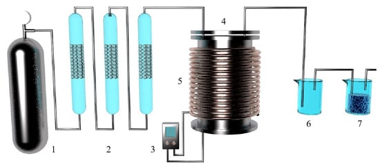A diagram showing the electrolysis experimental system device including 1. Ar gas cylinder; 2. gas drying system; 3. WZK temperature controller; 4. reactor; 5. tap resistance furnace; 6. buffer bottle and 7. tail gas absorption bottle.