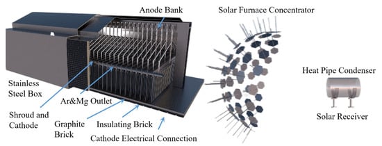 - Korenko, M.; Larson, C.; Blood, K. Technical and Economic Evaluation of a Solar Thermal MgO Electrolysis Process for Magnesium Production. Energy 2017, 135, 182–194. [Google Scholar] [CrossRef]