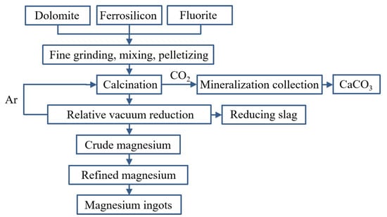 Restricted by the principle, the Pidgeon process has the disadvantages of large consumption of raw materials, high energy consumption and large carbon emissions, and it is difficult to reduce the energy consumption and carbon emissions of the Pidgeon process []. Under the conditions including a reduction temperature of 1200 °C, reduction time of 2 h, excess coefficient of 5% aluminum powder and briquetting pressure of 30 MPa, NaiXiang Feng et al. [] used the mixed minerals of dolomite and magnesite as raw materials (the mass ratio of material to magnesium was 3.1~3.3:1) to produce magnesium with the vacuum aluminothermic reduction, and prepared aluminum hydroxide by reducing slag. The results showed that the reduction rate of magnesium can reach more than 89%. The main phase of the slag was CaO·2Al2O3, and the content of Al2O3 was 67%. The leaching rate of alumina can reach more than 85% in the form of sodium aluminate in CaO·2Al2O3 alkaline solution. Compared with the Pidgeon method, the ore consumption was reduced by 50%, the energy consumption of the reduction process was reduced by more than 45% and the magnesium reduction rate was increased by more than 5%. Thus, comprehensive utilization of the reduction slag was realized. Qingfu Guo [] used magnesite as raw material to carry out an aluminothermic reduction magnesium smelting test. It was concluded that compared with the silico-thermic method, the reduction temperature was reduced by 50 °C, and the energy consumption per ton of magnesium was reduced by about 80~90%.