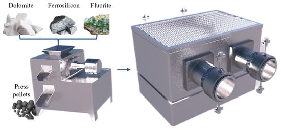 - Li, R.; Liu, F.; Zhong, J. Experimental Study of Magnesium (Mg) Production by an Integrated Calcination and Silicothermic Reduction Short Process. Metall. Mater. Trans. B 2021, 52, 558–569. [Google Scholar] [CrossRef]