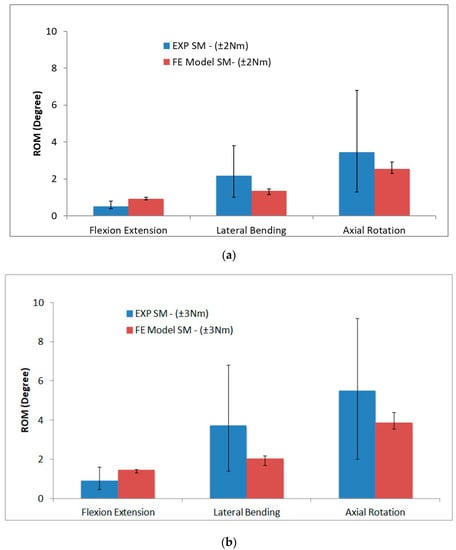 Further analysis of the synthetic FE model was carried out to compare the ROM against the experimental data [17]. Based on the average percentage differences, the synthetic FE model ROM at ±2 Nm loads for the flexion/extension and lateral bending movements were the closest to the experimental result of paediatric ROM. For the axial rotation movement, the ±3 Nm loads of the synthetic FE model had the lowest percentage of ROM difference, as compared with the paediatric FE model. Therefore, both of the moments were subsequently compared with the experimental data as depicted in Figure 5. The average ROM of the synthetic paediatric spine for both the moments and for all six DOF of experimental data were higher than the values reported in the FE model, apart from the flexion/extension. The average differences for both moments varied from 30% to 60%, while the average T4–T8 ROM of synthetic paediatric FE model were within the data set range, according to the experimental data. As presented in Figure 5, the ROM from experimental data increased significantly (by 50%) from ±2 Nm to ±3 Nm loads, which suggested that the synthetic paediatric spine was more flexible after the ±2 Nm loads.