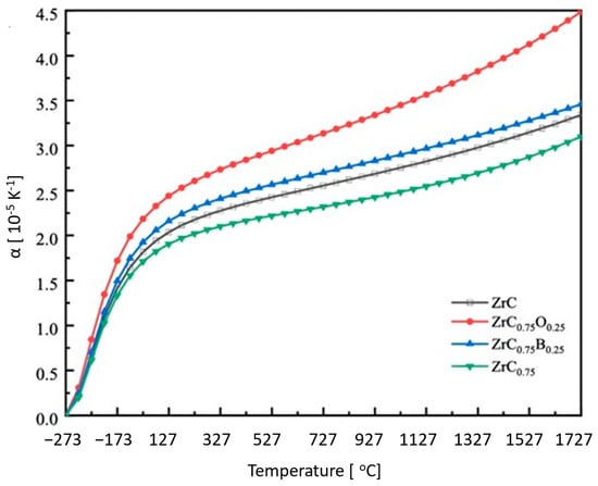 At ultra-high temperatures, the coefficient of thermal expansion (CTE) is a key material property for WLE applications. Dimensional stability is critical to design safe and reliable components made from ZrC. The CTE vs. temperature of ZrC is presented in Figure 7 [].