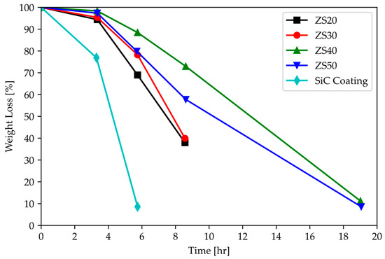 From the work of Gasparrini et al., ZrC exhibits linear oxidation kinetics, as shown in Figure 12 []. This indicates that chemical reaction is the rate-limiting step; hence, the diffusion of zirconium (or carbon) to the surface is unlikely to be the oxidation reaction driver. Knowledge of this rate-limiting step suggests that a coating to prevent the surface of ZrC from interacting with air can be effective in hindering oxidation.