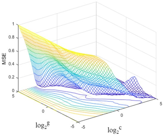 The hyperparameters c and g have a significant effect on the performance of the prediction model. The grid is divided into a range of coordinates and according to a specified step, and all grids are traversed. The evaluation metrics (e.g., RMSE and MSE) are obtained by searching all combinations of parameters c and g for each selected grid node one by one using K-fold cross-validation. K-fold cross-validation is a statistical technique that can successfully remove the training bias brought on by sampling irrationality []. Subsequently, the search range and step are then adjusted according to the values of the evaluation metrics, and the best combination of c and g is the one that provides the best performance of the model cross-validation metrics. As shown in Figure 6, the search range for c and g was set to (2−5,25) with a step of 20.2. All grids were traversed and all combinations of parameters c and g were searched for each selected grid node one by one. The best model was determined with the lowest value of MSE using 5-fold cross-validation. Optimal solutions for the parameters in the search range are obtained in the optimal choice of parameters c and g.