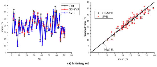 After obtaining the optimal combination of hyperparameters, the framework of the GS-SVR model for estimating the peak dilation angle is shown in Figure 7. In machine learning, a training set is typically used to build the model and verify the model’s ability to predict new data on an independent test set []. Therefore, the original dataset is randomly divided into two subsets after the dataset normalization: the training set and the test set. Through optimization analysis, 80% of the entire dataset was included in the training set and the remaining 20% was included in the test set.