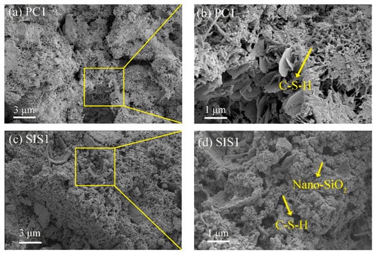 Related studies have shown that pores with a pore size below 10 nm are gel pores, capillary pores with a pore size between 10 and 50 nm are mesopores, and pores with a pore size between 50 and 10,000 nm are referred to as macropores []. It is generally believed that the more pores less than 50 nm, and the fewer the pores larger than 100 nm, the better the performance of concrete. The pore distribution maps of different specimens demonstrated percentages of different pore sizes by 10 nm, 50 nm and 1000 nm (Figure 14b). The percentages of macropores in the SIS1, SIS2, SIS3, SIKS and SKS groups were 79.61%, 77.92%, 78.32%, 68.56% and 70.83%, respectively. The total porosity in the SIS1, SIS2, SIS, SIKS and SKS groups are shown in Table 2. The larger the percentage of large pores, the more unfavorable it is for cementitious materials. Nano-silica and silica fume can densify the pore space, but the hydrophobic agent will be wrapped on the surface of cement particles and affect the hydration of cement. The hydrophobic agent affects the gelling of hydration products and hinders the connection of cement particles to form a continuous network structure. This, in turn, causes loose hydration products to impact the pore space within the structure. The volcanic ash effect generates more C-S-H gels, which leads to an increase in the number of mesopores and gel pores in the cementite. Another important pore parameter is the threshold pore size, which is closely related to the connectivity of the pores and the permeability of the cementitious material. The threshold apertures for the SIS1, SIS2, SIS3, SIKS and SKS groups are shown in Table 2. The SKS had the smallest threshold apertures. This indicates that the pore connectivity of the SKS group was lower and the pore structure was denser [,]. This was consistent with the results of the SKS micro-morphology. The SEM picture of SKS had a dense structure with a smaller pore structure (Figure 9k).
