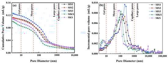 The pore parameters of the superhydrophobic cementitious materials prepared with different hydrophobic agents are shown in Figure 14. The pore volumes of the SIS1, SIS2, SIS3, SIKS and SKS groups were 0.1124, 0.1129, 0.1258, 0.1000 and 0.1081 mL/g, respectively (Figure 14a). The pore volume in the compound dosage group (SIKS) was lower than that in the single dosage group (SIS1, SIS2, SIS3). This suggests that the KLJ contributes to pore compaction and structural densification. The pore volume steadily rose within the single dosage group (SIS1, SIS2, SIS3) as the IBTES dosage increased. This phenomenon may be attributed to the influence of IBTES on hydration, impeding the compact growth of C-S-H. The difference in pore volumes between the groups was not significant and indicated that the nanomaterials filled the pores and enhanced material compactness. Mercury compression measurements show that the SIKS and SKS groups had the lowest porosity, while the SIS3 group exhibited the lowest water absorption. This indicates that porosity had an impact on water absorption, but it is important to recognize that superhydrophobicity also exerts an influence on water absorption. The porosity and superhydrophobicity play a combined role in determining water absorption in cementitious materials.