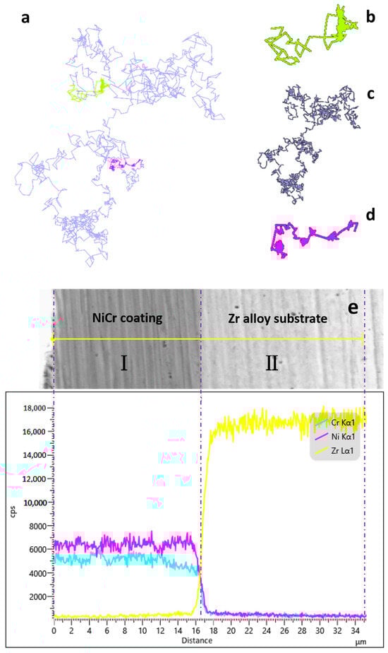 During the LMM process, the surface of the coating and substrate were remelted. The atoms ran with each other following the law of diffusion and were fused after solidification. The diffusion of elements was revealed by simulating the movement of atoms. Figure 4a demonstrates the trajectories of the calibrated atoms throughout the model operation. Figure 4b illustrates the motion trajectory of an atom detached from its original ordered position and changed to a disordered atom after heating. The initial thermal motion of the atoms was affected by the crystal structure. The atoms only migrated within a small range; hence, the initial part of the trajectory was dense. As the temperature continued to increase, the crystal structure was disrupted, the thermal motion of the atoms increased, and the migration of the atoms increased and became unstable []. Figure 4c shows the motion trajectories of the atoms during the disordered process when all the atoms were in a disordered state without lattice constraints and had a large range of motion. Figure 4d shows the trajectory of the atoms after the model started to crystallize. When the temperature decreased, the model started to form a crystal structure. As the model atoms were subjected to lattice confinement, both the migration and range of motion decreased, and the system eventually stabilized. As shown in Figure 4e, the EDS line scan of the specimen cross-section before LMM revealed a clear boundary between the coating and substrate portions. There was a sharp drop in the distribution of the elements in the figure, indicating that the different coating elements did not diffuse between each other. This corresponded to the characteristics of the coatings prepared using PVD technology. Figure 4f demonstrates the EDS line scan of the specimen cross-section after LMM treatment, where I is the NiCr alloy coating region, II is the metallurgically bonded region, and III is the Zr alloy substrate region. The atoms absorbed external energy and underwent migration and diffusion. The crystal lattice in the coating was destroyed and recombined to form a new crystal structure. The elements diffused into each other and solidified, transforming the physical bond between the coating and substrate into a metallurgical bond. The formation of metallurgical bonding zones enabled the coating to maintain excellent adhesion and enhanced the coating protection in high-radiation thermal shock environments [].