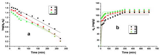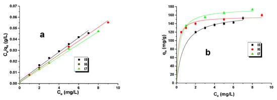 Figure 6a illustrates the impact of the malachite green solution’s pH on the adsorbent’s sorption capacities. These outcomes demonstrate that the dye removal efficiency increases with the rise in pH of the dye solution, regardless of the adsorbent specimen. Notably, samples I5 and I6 exhibited the most significant influence. Conversely, sample I7 showed the least effect from the dye solution’s pH. Furthermore, the study determined that the pH levels of the zero-charge points (pHpzc) for the examined adsorbents are 8.0 for I5, 7.8 for I6, and 7.6 for I7, correspondingly (Figure 6b). Therefore, it is crucial to uphold an environment pH above these pHpzc levels to secure a negatively charged carbon adsorbent surface, which subsequently escalates the adsorption capability of the tested pollutants. Additionally, the formation of a covalent bond between hydroxyl ions and dye cations is viable.