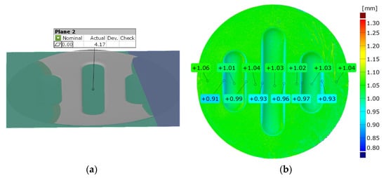 For the surface flatness measurement, the best plane-matching function was used. This function determined two parallel planes adjusted to the most protruding and the most concave part of the selected surface on the model. The flatness of the surface was determined with the distance between these planes. Figure 13 shows an example result of measuring the surface flatness.