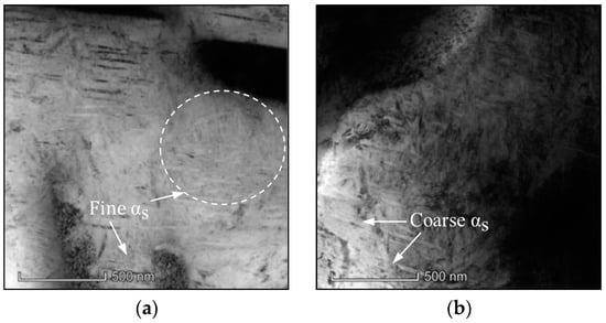 Figure 3 shows the influence of aging temperature on the formation of αs phases. A few dislocations and substructures are found. The precipitated αs phases are cross-distributed irregularly, and their thickness varies from 0.2 to 0.6 μm. Also, the orientations of the precipitated αs phases are random []. As illustrated in Figure 3a, αs phases with a fine acicular shape precipitate, and several unaged areas appear in the βm at an aging temperature of 400 °C. Meanwhile, distinguishing αs phases from βm is tricky because the boundaries of αs phases are blurred. Due to the high content of β-stable elements in βm and a smaller driving force for solute atom diffusion at lower aging temperatures, the transformation for βm to αs phases is insufficient (Figure 3a). Therefore, the content of αs phases is extremely low, and the average thickness is small at lower aging temperatures. As the temperature increases, the massive αs phases precipitate in a complete aging process (Figure 3b–d). Moreover, the αs phases coarsen and tightly weave together. The αs/β interfaces are visible, especially at high aging temperatures, such as 600 °C, and the average thickness of αs phases increases to about 0.47 μm (Table 2). So, αs phases are sensitive to the variations in aging temperature, and the coarsening rate of αs phases is obviously affected by the diffusivity of solute atoms [].
