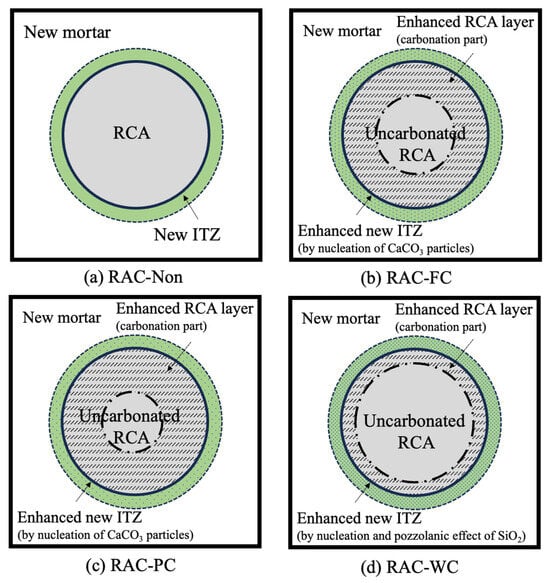 In order to understand the effect of enhancement methods on chloride permeability in RAC, it is necessary to understand the difference between ion transport channels in RAC and NAC. As is well known, the meso-three phases of NAC consist of mortar, coarse aggregate, and an interfacial transition zone (ITZ). However, the mesoscopic composition in RAC is different from NAC. RA is composed of NA and adhered mortar, which is part of the mortar in parent concrete, as shown in Figure 1. Due to the existence of RA, the ITZs in RAC can be categorized into three types: (i) ITZ1: lying between the virgin aggregate and new mortar; (ii) ITZ2: lying between the old mortar and new mortar; (iii) ITZ3: lying between the old mortar and NA. Thus, mesoscopic RAC is composed of NA, new and old mortar, and three categorizes of ITZs, as shown in Figure 1. The high chloride ion permeability of RAC compared with NAC can be attributed to the fact that: (i) RA consists of 65–70% NA and 30–35% old mortar [,] (NA is a dense material that is nearly impermeable, while mortar is permeable due to the existence of pores, cracks, etc.). (ii) Due to the higher water absorption of RA, the w/c ratio in ITZ2 in RAC is higher than ITZs in NAC, which results in the ITZ2 in RAC having a larger width and lower micro-hardness []. (iii) The higher mud content in RA may result in ITZ1 in RAC having a larger width and lower micro-hardness []. (iv) The total length of all ITZs in RAC is 60–70% larger than that in NAC []. It is worth noting that the high content of acicular calcium hydroxide crystals is the main reason for the low micro-hardness and high chloride ion penetration [].