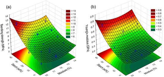 The results obtained from the empirical data were statistically processed using the following statistical software: StatSoft, Inc. (Tulsa, OK, USA, 2013), STATISTICA, version 13.1 (TIBCO Software Inc., Palo Alto, CA, USA) (Table 1). For statistical analyses, the DOE experiment planning module (compositional master plans) was used, where significance was determined by the ANOVA test. The confidence level that indicated significant differences between samples was set at 95% (p < 0.05). Next, three-dimensional plots (response areas) were made from the data obtained. The above empirical test plan was applied to present the results: bonding strength, Young’s modulus, wetting angle, and L*a*b* colour parameters. In order to present results of the TGA and FTIR analyses, extreme measurement points from the model were selected (moisture: 10 and 14%). The tests were performed in 3 replicates.
