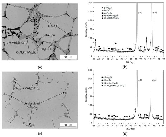 Figure 1 shows the microstructure (LM) and phase composition (XRD) of recycled 2017A aluminum alloy in the as-cast state (Figure 1a,b), supersaturated solid solution state (Figure 1c,d), and supersaturated plus naturally aged state at ~25 °C for 155 h (Figure 1e,f). Based on previous examinations and results [] from microscopic observations as well as XRD studies, it was demonstrated that the as-cast microstructure of the 2017A alloy obtained from recycling consists of the following phases: binary θ-Al2Cu and β-Mg2Si phases, a ternary Al7Cu2Fe phase, quaternary Q-Al4Cu2Mg8Si7 phase, and quinary α-Al15(FeMn)3(SiCu)2 phase. Analysis of these results shows that the largest relative volume is occupied by precipitates of the binary θ-Al2Cu phase (Figure 1a,b). The XRD spectrum (Figure 1b) exhibited the highest number of high-intensity reflections originating from this phase. Microscopic observations (Figure 1c) and XRD analysis (Figure 1d) of the solution heat-treated samples at 510 °C showed that during annealing for 6 h, most of the primary precipitates of Al2Cu, β-Mg2Si, and Q-Al4Cu2Mg8Si7 intermetallic phases observed after casting (Figure 1) were dissolved in the solid α-Al solution (Figure 1c,d). However, the morphology of the remaining undissolved intermetallic precipitates, mainly those containing Fe, also changed. It was found that during annealing to supersaturation, the edges of the α-Al15(FeMn)3(SiCu)2 phase particles, which appeared in the cast state in the form of Chinese script, became rounded. Additionally, during annealing at 510 °C for six hours, the lamellar and needle-like particles of the Al7Cu2Fe phase transformed into spheroidal-like particles of the α-Al15(FeMn)3(SiCu)2 phase (Figure 1c). The microstructure of the 2017A alloy after artificially aging for 55 h at 175 °C exhibited very fine, dispersive precipitates homogeneously distributed throughout the alloy volume (Figure 1e). A prolonged aging time leads to the precipitation of stable equilibrium phases, their growth, and coagulation. Based on XRD diffractometric results (Figure 1f), previous studies [], and the literature data [,,], it can be stated that the main phases of strengthening in the 2017A alloy are the θ-Al2Cu and Q-Al4Cu2Mg8Si7 precipitates.