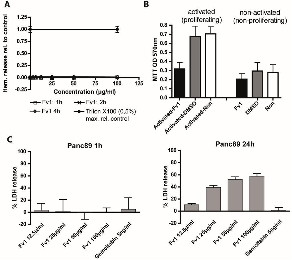 To characterize the anti-proliferative activity in more detail, we measured acute cytotoxicity by a lactatdehydrogenase (LDH) release assay (Figure 9D). Cancer cell lines did not release LDH after 1 h of treatment with Fv1, but after 24 h we detected a dose-dependent high LDH release (Figure 9C). This indicates a cytotoxic effect of Fv1 after 24 h, but argues against acute cytotoxicity.