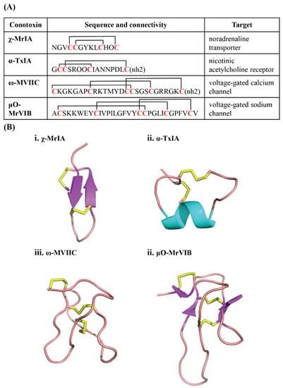 - Kaas, Q.; Craik, D.J. Conotoxins and other conopeptides. Outst. Mar. Mol. 2014. [Google Scholar] [CrossRef]