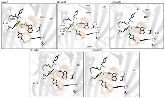 - Rucktooa, P.; Smit, A.B.; Sixma, T.K. Insight in nAChR subtype selectivity from AChBP crystal structures. Biochem. Pharmacol. 2009, 78, 777–787. [Google Scholar] [CrossRef] [PubMed]