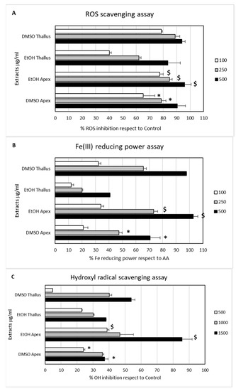 Antioxidant activity of E. amentacea extracts in spectrophotometric tests. (A) ROS scavenging activity by the DPPH assay. Data are expressed as a percentage of scavenging of the DPPH radical with respect to the absorbance of the DPPH radical alone (control). Symbols indicate significance in paired Tukey test (ANOVA p < 0.0001; Tukey of DMSO apex vs. DMSO thallus’ respective concentration, * p < 0.05; Tukey of EtOH apex vs. EtOH thallus’ respective concentration, $ p < 0.05) (B) Fe (III)-reducing power assay, measured by the potassium ferricyanide method. Data are expressed as a percentage of reducing power compared to the Fe reduction of ascorbic acid (AA, concentration 30 μg/mL) positive control. Symbols indicate significance in paired Tukey test (ANOVA p < 0.000001; Tukey of DMSO apex vs. DMSO thallus’ respective concentration, * p < 0.05; Tukey of EtOH apex vs. EtOH thallus’ respective concentration, $ p < 0.005). (C) OH radical scavenging activity by Mohr’s salt assay. Data are expressed as a percentage of inhibition of OH radical production with respect to the absorbance of the OH radical-producing solution alone (Control). Symbols indicate significance in paired Tukey (ANOVA p < 0.0001; Tukey of DMSO apex vs. DMSO thallus’ respective concentration, * p < 0.05; Tukey of EtOH apex vs. EtOH thallus’ respective concentration, $ p < 0.05). (D) NO radical scavenging activity was measured by the sodium nitroprusside method coupled with the Griess assay. Data are expressed as a percentage of inhibition of NO production with respect to the absorbance of the NO radical-producing solution alone (Control).