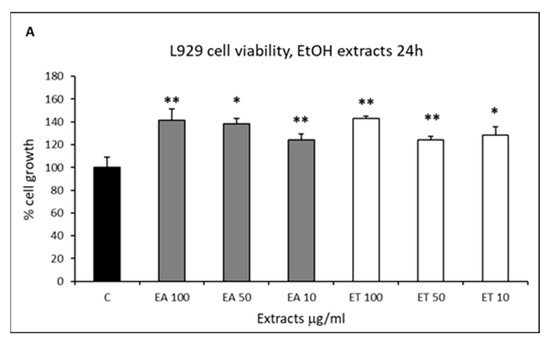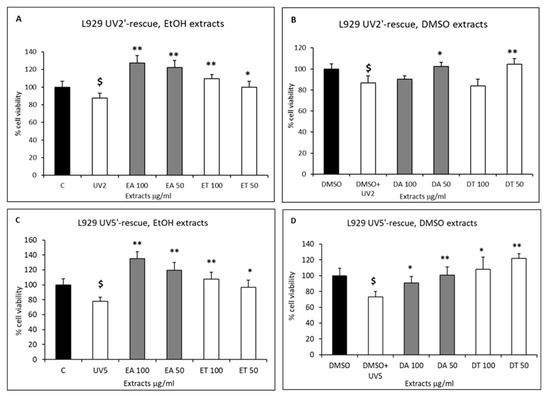 The results show that in both cases, the extracts were able to rescue, partially or totally, the detrimental effects of the two stressful stimuli. In detail, UV-B radiation for 2 or 5 min induced, respectively, 13% or 26% cell death in the L929 fibroblasts compared to the control cells (Figure 3A,B and C,D, respectively).