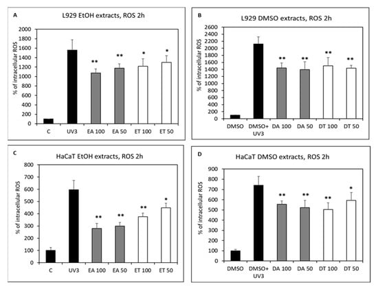 It is well known that most of the cell-damaging effects of UV radiation and acute inflammation are due to the production of high amounts of ROS [12], with the consequent oxidation and deterioration of fundamental cellular components (proteins, nucleic acids, lipids). Therefore, we evaluated the four extracts’ ability to scavenge UV- and H2O2-derived ROS production (Figure 5), which would explain the cell death-reversing effect of the extracts described in the previous paragraph.