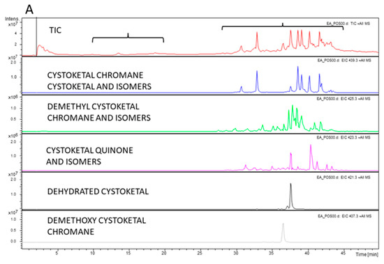 In detail, the two MS chromatograms in red (the total ion chromatogram in the first inserts in both Panels A and B) show a group of peaks in the timeframe between a 10- and 20-minute retention time, which the MS analysis ascribed to the polyphenol family, and a second, more significant group of peaks, starting from the 28-minute retention time, belongs to the meroditerpene family. The heights of the peaks in the two chromatograms show that the meroditerpenes species are more abundant in the apices (Panel A) as compared to the thalli (Panel B). Thus, we focused on their characterization to ascribe the functional differences between the extracts from the two body parts of the seaweed. We observed that the two seaweed body parts contained the same meroditerpenes compounds. In fact, both panels reporting the extracted ion chromatograms (EIC) of the same identified molecules show the following species: cystoketal, cystoketal chromane and their related isomers (blue EIC in both panels, m/z 439.3), dimethyl cystoketal chromane and their related isomers (green EIC in both panels, m/z 425.3), cystoketal quinone and their related isomers (pink EIC in both panels, m/z 423.3), dehydrated cystoketal (black EIC in both panels, m/z 421.3) and dimethoxy cystoketal chromane (gray EIC in both panels, m/z 407.3). Indeed, the presence of meroditerpene-like structures has already been described in the same genus, and some of their biological effects have also been investigated [4,5,36,53,54,55,56,57,58]. Furthermore, the main molecular structures—although without the characterization of the isomers—were also identified in our previous work, both for the EtOH and DMSO extracts of the total fronds of the seaweed [23]. The main chemical structures of the molecules are shown in Table 2, which also reports the literature on the up-to-date investigated pharmacological properties of the listed species.