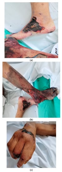 (a–d) Dry gangrene at the level of the lower 2/3 of the left calf, bilateral leg and right hand, amputation of the left thigh is performed.