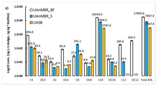 The importance of AHL C4-HSL, C6-HSL, 3-oxo-C6-HSL, C8-HSL, 3-oxo-C8-HSL, C10-HSL, 3-oxo-C10-HSL, C12-HSL, 3-oxo-C12-HSL, C14-HSL, and 3-oxo-C14-HSL has been reported recently in relation to different bacteria-mediated processes in mesophilic (37 °C) batch-fed anaerobic digesters, (organic loading rate of 1.5–2 kg COD m−3 day−1) fed with synthetic wastewater []. In that study, the total AHL concentrations were generally higher than those observed in the current study. However, the concentrations of all AHL present in a conventional UASB (37 °C, 2 kg COD m−3 day−1) were considerably lower (at 0–6 ng L−1) than those observed in the UASB, AnMBR, and UAnMBR of the current study (Figure 2), with C4-HSL being the highest (6 ng L−1) []. Additionally, C8-HSL, 3-oxo-C8-HSL, C10-HSL, and C12-HSL were not detectable in the conventional mesophilic UASB, but they were present in the UASB of the current study. A plausible reason could be the higher temperature (37 °C) of their experiment and use of synthetic wastewater (absence of non-acclimated cells). It may be significant that some AHL, namely C6-HSL, 3-oxo-C6-HSL, and 3-oxo-C8-HSL were not detected in the sludge or biofilm of the AnMBR, but they were found in the UASB and UAnMBR (both sludge and biofilm). Therefore, since these bioreactors both contained a more structured biomass in the form of granular sludge (or at least denser flocs), it is possible that the microbial communities in these UASB setups could have excreted these specific AHL as part of the granulation formation process that occurs naturally in upflow systems, which agrees with observations reported previously [].
