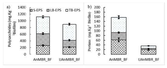 The scraped biofilm was suspended in phosphate buffer solution (PBS) to make a 10 mL sample volume. The biofilm and PBS suspension were shaken well by hand to disperse the biofilm thoroughly. Sludge and biofilm suspension (10 mL) were centrifuged for 5 min at 6000 × g (4 °C). The supernatant was collected, and a 0.2 μm cellulose acetate filter (Millipore, Merk UK) was used to filter the suspended particles. The content of the proteins (PN) and polysaccharides (PS) in the solution represented the soluble EPS/soluble microbial product (SMP). The sludge and biofilm sample pellets were resuspended in 10 mL PBS and sonicated for 2 min using ultrasonic cleaner (9USC-TH, VWR, Bristol, UK). The suspension was placed in a shaker (KS400i, IKA, Oxford, UK) at 150 rpm for 10 min and centrifuged at 8000× g for 10 min. The harvested supernatant was filtered, and the PN and PS present in the filtrate were denoted loosely bound EPS (LB-EPS). The pellets in tubes were re-suspended in 10 mL PBS and re-sonicated for 3 min. Subsequently, the sludge was exposed to sonication for 3 min. In each tube (10 mL), 2 g of hydrated CER (cation exchange resin) (Dowex® Marathon® C sodium form, Sigma-Aldrich, Kent, UK) was added in the suspension. Then, the solution was centrifuged at 12,000 × g (30 min) and the content of PS and PN in the supernatant was defined as tightly bound EPS (TB-EPS) [,,].