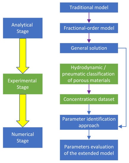 A flowchart of the research methodology is presented in Figure 1. It consists of the following three main stages: analytical (both classical and a proposed new one), experimental (obtaining results in a hydrodynamic apparatus), and numerical (evaluating the parameters of the fractional order mathematical model).