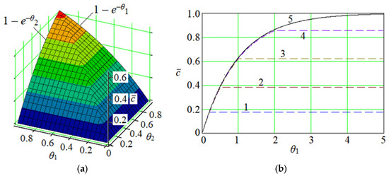The reduced dimensional solution (11): (a)—the spatial surface; (b)—plane curves for different values of θ2: 1—0.2; 2—0.5; 3—1.0; 4—2; 5—.