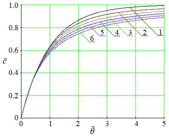 Finally, the stationary mode occurs for significant values of the comprehensive criterion , where —diffusion Fourier number. This result entirely corresponds to the stationary convection equation describing the steady-state behavior of such systems. In this case, the time derivative can be neglected, and the concentration field leads to the limiting function with the analogous boundary condition .