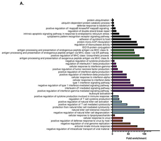 To obtain a more global perspective on what genes TCF19 could be regulating, we performed RNA-seq analysis on INS-1 cells overexpressing hsTCF19. Notably, this revealed only a relatively small number of differentially expressed genes. Of the 160 genes differentially expressed between the groups (false discovery rate (FDR) < 5%), 136 genes were upregulated and 24 were downregulated (Table S1), suggesting that TCF19 likely acts as a positive regulator of transcription. 92 gene IDs were identified as being upregulated >2-fold from the original list of 136 upregulated genes, and of these, 85 were uniquely mapped and included in the PANTHER Fisher’s Exact overrepresentation test [,,]. This analysis revealed 199 significantly overrepresented Biological Process Gene Ontology (GO) terms (FDR < 5%). These GO terms were sorted hierarchically and the most specific subclasses of GO terms are listed in Figure 2A. This analysis shows that genes upregulated with hsTCF19 overexpression are highly enriched for biological processes relating to double-strand break repair, apoptosis in response to ER stress, antigen presentation, interferon signaling, immune system processes, and viral responses (Figure 2A).