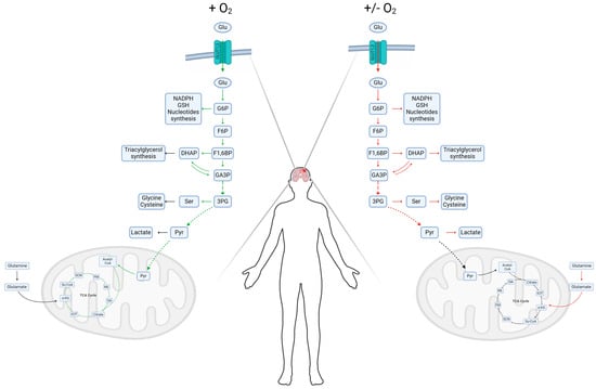 Hypoxia induces metabolic reprogramming in GBM cells [], which favors biomass production to sustain tumor proliferation, synthesizing metabolic intermediates via glycolysis activation []. Sanzey et al. demonstrated that patient-derived stem cells and glioblastoma cells subjected to severe hypoxia (0.1% O2) overexpress glycolytic enzymes such as HX2, PFK1, ALDOA, PGAM1, ENO1, -2, and PDHK1 []. Knockdown of each of those genes inhibited cell proliferation, inducing cell death in both stem cells and U87 glioma lines under hypoxic conditions []. These results suggest that glycolytic enzymes are essential for cell survival under hypoxic conditions and for tumor growth in vivo. Thus, these enzymes are potential therapeutic targets against GBM []. Kucharzewska et al. reported increased expression of GLUT1, -3, -4, MCT4, HX2, PFKFB3, -4, ALDO, PGK1, and PDHK3 mRNA, as well as glycolytic intermediates such as Glu, G6P, F6P, F1,6BP, and 3-phosphoglycerate [] (Figure 2).