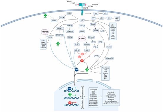 The oncogenic activation of PI3K/AKT and RAS/RAF/MEK/ERK signaling pathway in glioblastoma either directly or indirectly promotes metabolic reprogramming. Directly, AKT and ERK promote an anabolic metabolism through phosphorylated key metabolic enzymes []. Moreover, AKT indirectly modulates various transcriptional factors such as forkhead box class O (FOXO), p53, sterol regulatory element-binding protein (SREBPS), hypoxia-inducible factor-1 (HIF1), and cellular-Myc (c-Myc), which are master regulators of cellular metabolism via downstream effects such as mammalian target of rapamycin complex 1 (mTOR), glycogen synthase kinase 3β (GSK3β), and mdm2 []. The over-activation of HIF1 and c-Myc regulates the expression of key gene groups involved in metabolism to support cellular proliferation angiogenesis, migration, chemo- and radio-resistance, and cell death resistance in glioma cells [,,]. Meanwhile, the tumor-suppressing protein p53, often lost in glioblastoma, negatively regulates HIF1 and c-Myc and modulates the balance among the glycolysis and oxidative phosphorylation (OXPHOS). These alterations in this triad of transcriptional factors induce a metabolic shift in glioma cells that allows them to adapt and survive drastic changes in the tumor microenvironment [,].