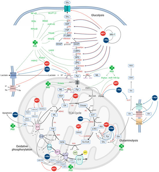 Role of transcriptional factors p53, c-Myc, and HIF1 in the regulation of glycolysis, oxidative phosphorylation, TCA cycle, and glutaminolysis. p53 inhibits the translocation of GLUT1,3 by inhibiting nuclear NF-κB. It also inhibits HX, PGM, enolase, PFKFB, MCT1/4, ME1, PDHK, and MCP 1/2 but activates PDH, GLS2, and complexes I and IV of the ETC. c-Myc and HIF1 positively regulates the transcription of most glycolytic pathway enzymes and LDH, MCT1/4, PDHK, IDH2, GTP2, GLS2, and complex I of the ETC. Moreover, c-Myc positively regulates the transcription of SLC7A1, SLC3A2, SLC5A1, GDH, GLS1, and HIF1 and induces the transcription of NHE1, PEPCK2, and complex IV of the ETC. Abbreviations: aconitase (AC), alanine (Ala), adenosine diphosphate (ADP), adenosine triphosphate (ATP), apoptosis-inducing factor (AIF), 1,3-bisphosphoglycerate (1,3BPG), cyclooxygenase 2 (COX-2), citrate synthase (CS), cytochrome c (Cyt C), cytochrome c oxidase (SCO2), dihydroxyacetone phosphate (DHAP), electron transport chain (ETC), flavine adenine dinucleotide (FAD), fructose-6-phosphate (F6P), fructose-1,6 biphosphate (F1,6BP), fumarate (FM), glucose (Glu), glucose-6-phosphate (G6P), glucose transporters 1,3 (GLUT1,3), glutamate dehydrogenase (GDH), glutamine (Gln), gluthatione (GSH), guanosine diphosphate (GDP), guanosine triphosphate (GTP), glyceraldehyde-3-phosphate (GA3P), glutaminase1,-2 (GLS1,2), glutamic-pyruvic transaminase 2 (GTP2), hexokinase (HX), hypoxia-inducible factor-1 (HIF1), IkappaB kinase (IKK), isocitrate (ICIT), isocitrate dehydrogenase (IDH2), α-ketoglutarate (α-KG), α-ketoglutarate dehydrogenase (α-KGDH), lactate dehydrogenase (LDH), LIM Homeobox Protein 9 (LHX9), malate (ML), malate dehydrogenase (MDH2), malic enzyme 1 (ME1), monocarboxylate transporter 1/4 (MCT1/4), mitochondrial pyruvate carrier (MCP 1/2), murine doble minute 2 (mdm2), Na+/H+ exchanger (NHE1), NADH:ubiquinone oxidoreductase (NDUF), dehydrogenase [ubiquinone] 1 alpha subcomplex and 4-like 2 (NDUFA4L2), nicotinamide adenine dinucleotide phosphate (NADPH), nuclear factor kappa-light-chain-enhancer of activated B cells (NF-κB), oxalacetate (OA), phosphoenolpyruvate (PEP), phosphoenolpyruvate carboxykinase 2 (PEPCK2), 6-phosphofructo-2-kinase/fructose-2,6-bisphosphatase (PFKFB), 2-phosphoglycerate (2PG), 3-phosphoglycerate (3PG), phosphoglycerate mutase (PGM), p53 upregulated modulator of apoptosis (PUMA), pyruvate dehydrogenase (PDH), pyruvate dehydrogenase kinase (PDHK), Ras-related associated with diabetes (RRAD), reactive oxygen species (ROS), succinate (SCN), succinyl-coenzyme A (Su-CoA), succinyl- CoA synthetase (SCS), succinate dehydrogenase (SDH), solute carrier family 5 member 1 (SLC5A1), solute carrier family 7 member 1 (SLC7A1), solute carrier family 3 member 2 (SLC3A2), TP53-induced glycolysis and apoptosis regulator (TIGAR), and tricarboxylic acid cycle (TCA). ↑ activation, ⊥ inhibition. The figure was created with BioRender.com.